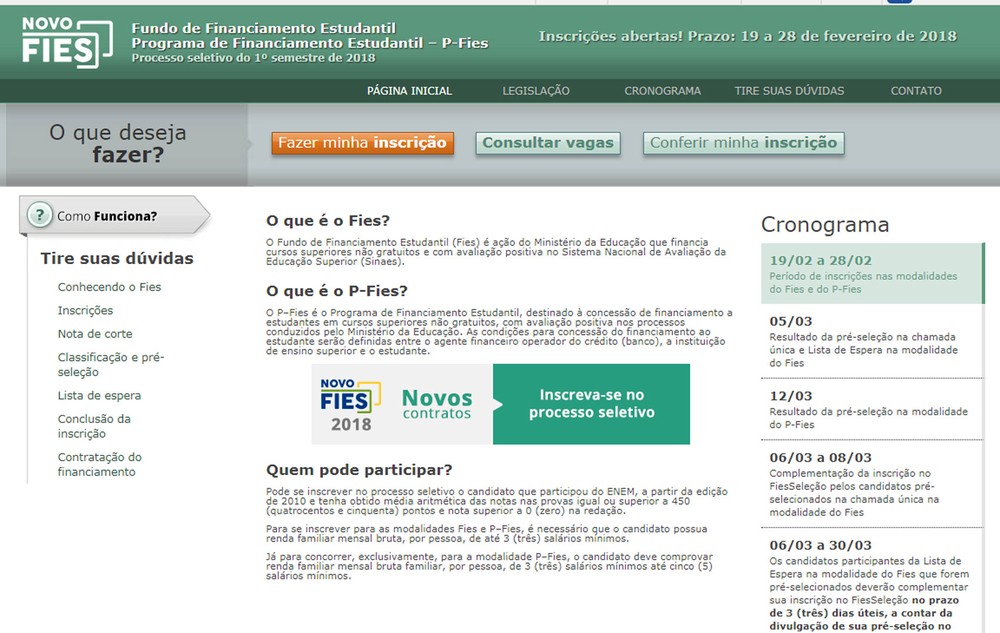 período de inscrições para o Fundo de Financiamento Estudantil (Fies) referente